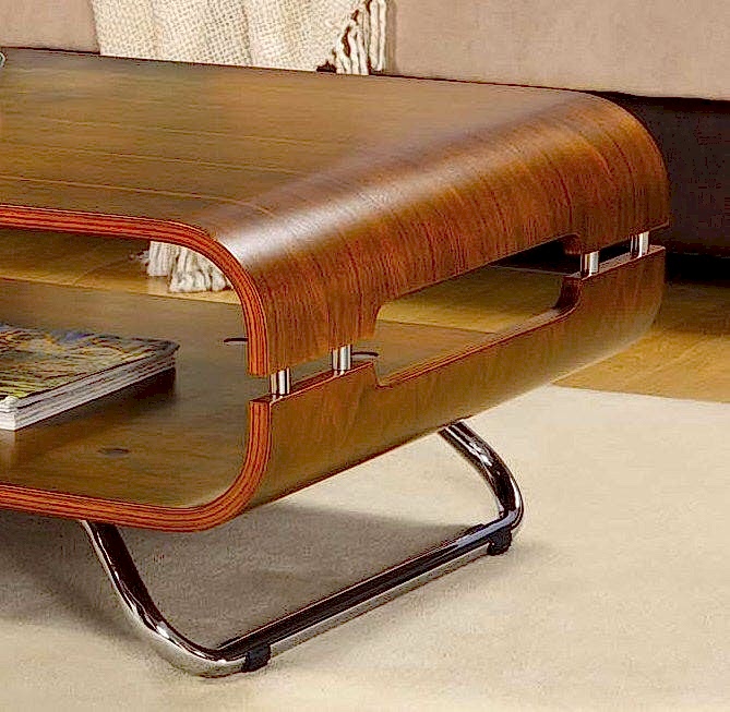 This coffee table is sure to fit nicely into any contemporary living room or home office. Its rounded design is both interesting and useful. This stand rests on two large metal legs. These have a polished chrome appearance and they compliment the dark brown colour of the body. Above the legs is a generous storage area. You'll have plenty of room for books, DVDs, CDs, magazines or anything else you want to keep handy. On top of this storage area is a large top. Here you will be able to put a vase, set of large candles or any other decorative item you want to show off.