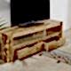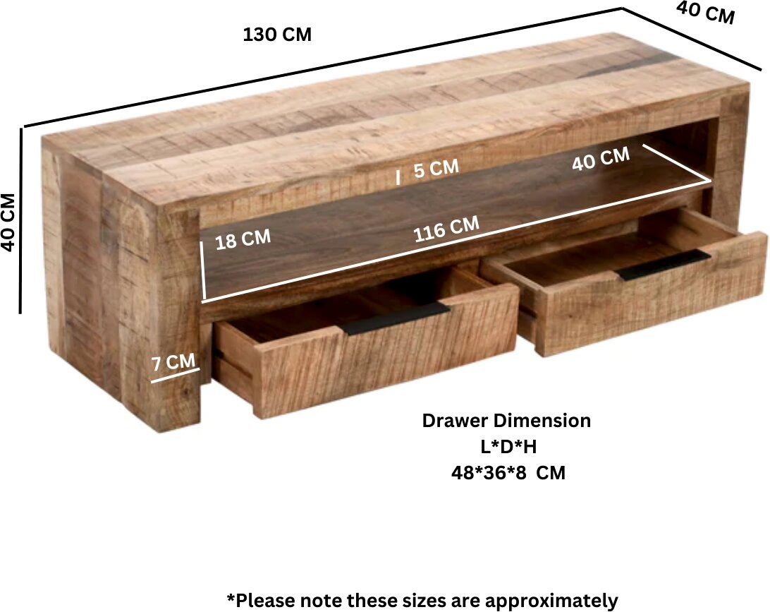 Made from 100% handmade mango wood, skilled craftsmen from India have fashioned a sturdy, TV stand complete with a large shelf for holding consoles and electronics. There are two spacious drawers for storing items like game controllers, remotes, CDs, and even extra cables.